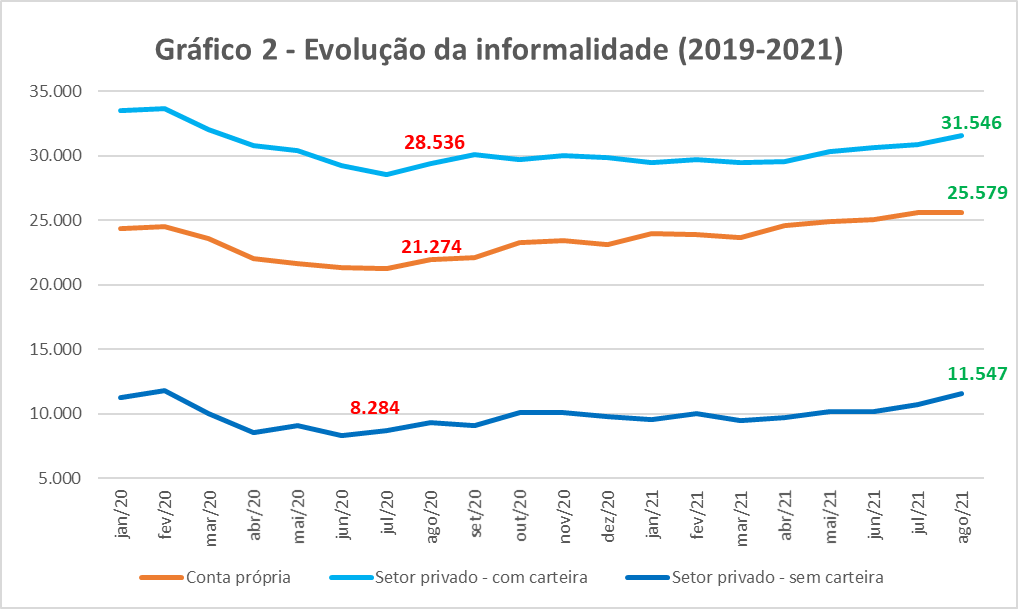 Calculating the increase in self-employed people as a percentage of the period July 2020 (lowest value) and August 2021, it is possible to see an increase of 20%. Analyzing the number of people without a formal contract in the private sector in the period of lowest value, June 2020, and August 2021, this growth is 40%. While those with a formal contract, in the same time interval, grew 10% in the period of the second quarter of 2020, there was a drop in admissions, as well as in dismissals, a period in which there was a large increase in cases of covid-19 and the unemployment rate. After that, there was an upward trend in the number of disconnections. While the number of admissions, showed ups and downs, having a growth in general.